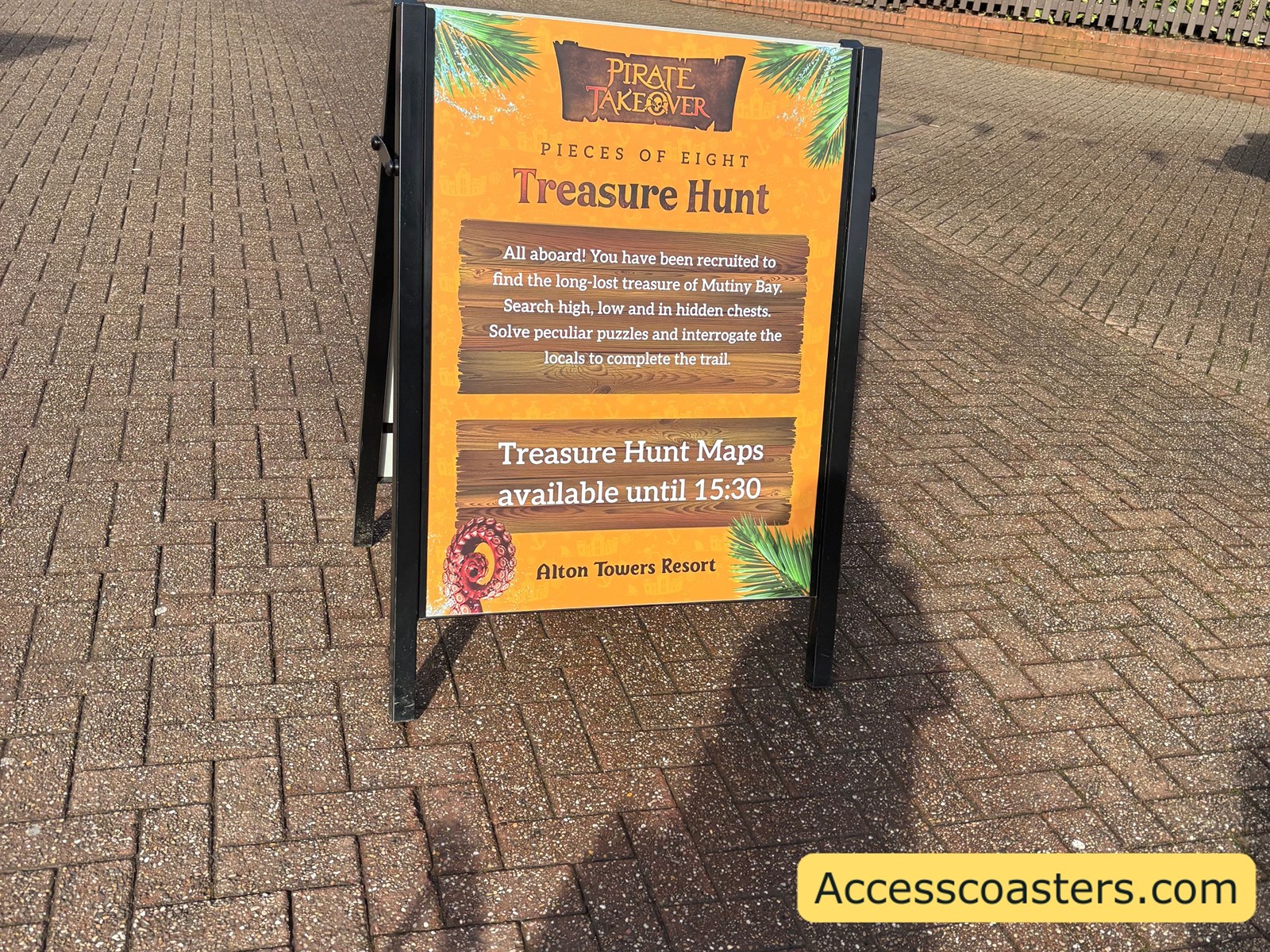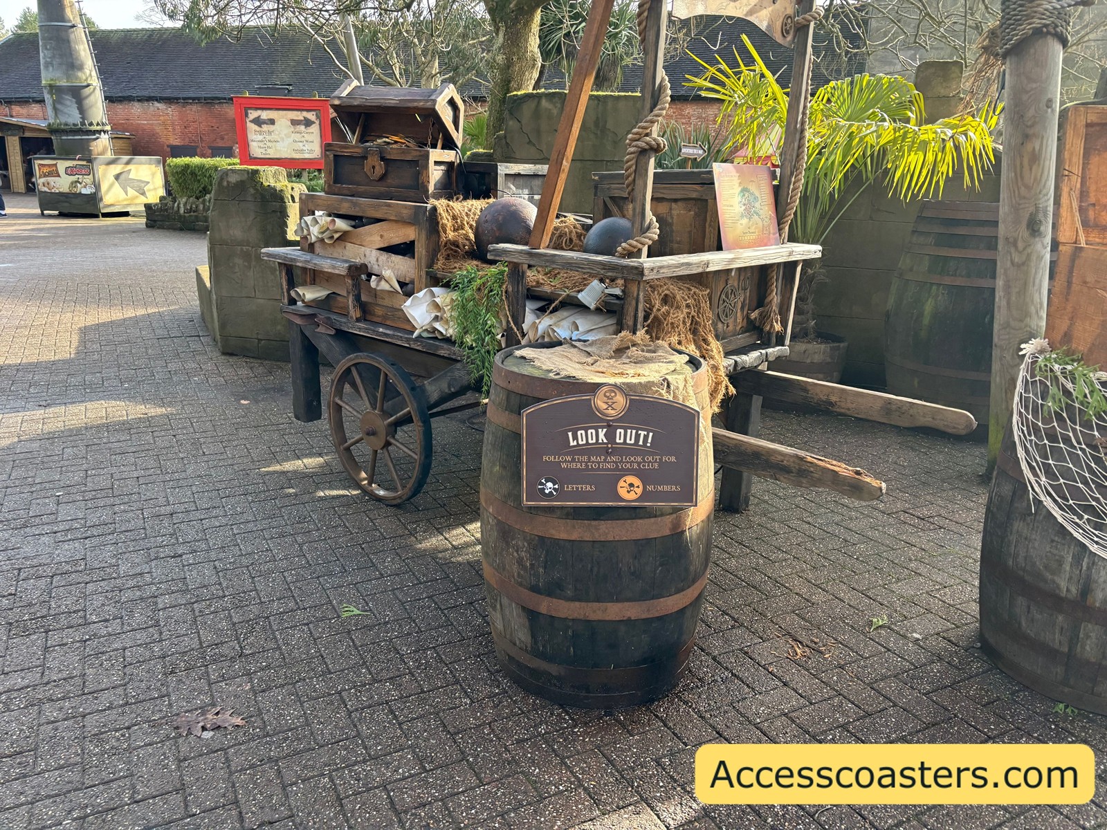 It wouldn’t be a pirate day out without some treasure! So of course the the treasure hunt has returned for the 2026 pirate takeover. Mutiny Bay has been taken over by a treasure hunt in order to find the mystery word or numbers to get a prize at the end. There are two different treasure hunts letters and number both have the same prize but numbers have easier challenges both options are open to all guests. In order to get the missing letters or numbers you need to complete a series of tasks and challenges where an actor will then reveal the letter or number you need. There were 8 different challenges at each one you got a letter or number for the secret code. As you can see from the images below the number tasks are indicated by the orange icon where as the letter ones are indicated by the black icon. The prize at the end was 2 chocolates and an Alton Towers pirate takeover themed golden coin. The treasure maps can be collected from the Mutiny Bay entrance and the last treasure maps are issued at 3:30pm.