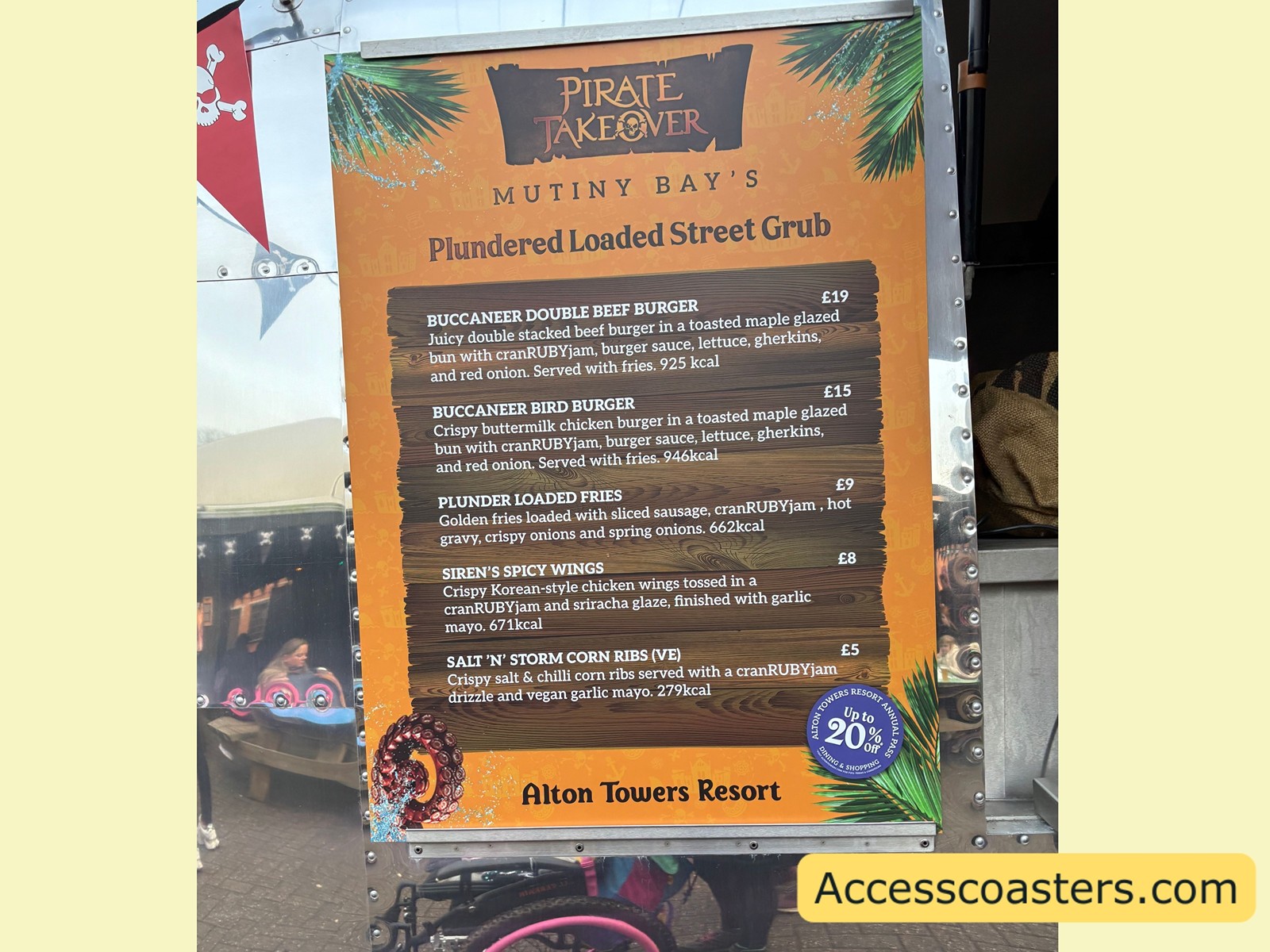 - Themed Food: There were a number of pirate themed food options in and around the Mutiny Bay Courtyard Theatre. The bar was open in the courtyard as well as some food trucks. Full information and pricing can be found in the ‘entertainment’ section of this blog post. As seen in the images below there was an additional food truck was located on Towers Street called the Chip Wrecked selling chicken and chips.