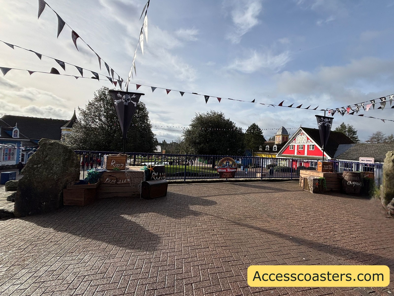 Located in the entrance plaza just before the turnstiles there are male, female and accessible toilets available. There is a fully accessible changing places toilet available once entering the park (to your right after you go through the turnstiles.) After going through the turnstiles you will go through a security check where a security guard will check your bag to make sure you haven’t got any forbidden items. For the pirate takeover event unlike the main season the security check is after You scan your tickets and go through the gate or turnstile as seen in the images bellow. Alton Towers have created a great social story about entering the theme park that you can find by clicking here Alton Towers social story for arriving and entering the theme park.