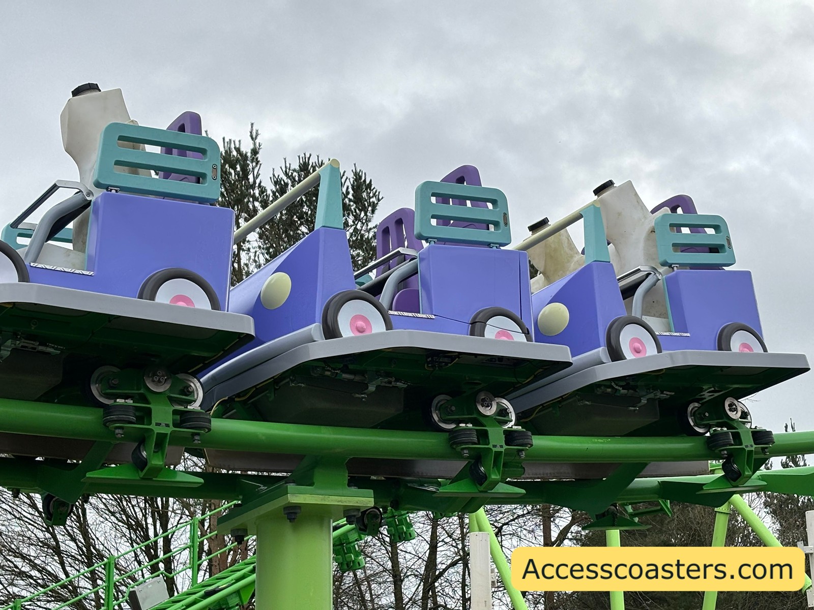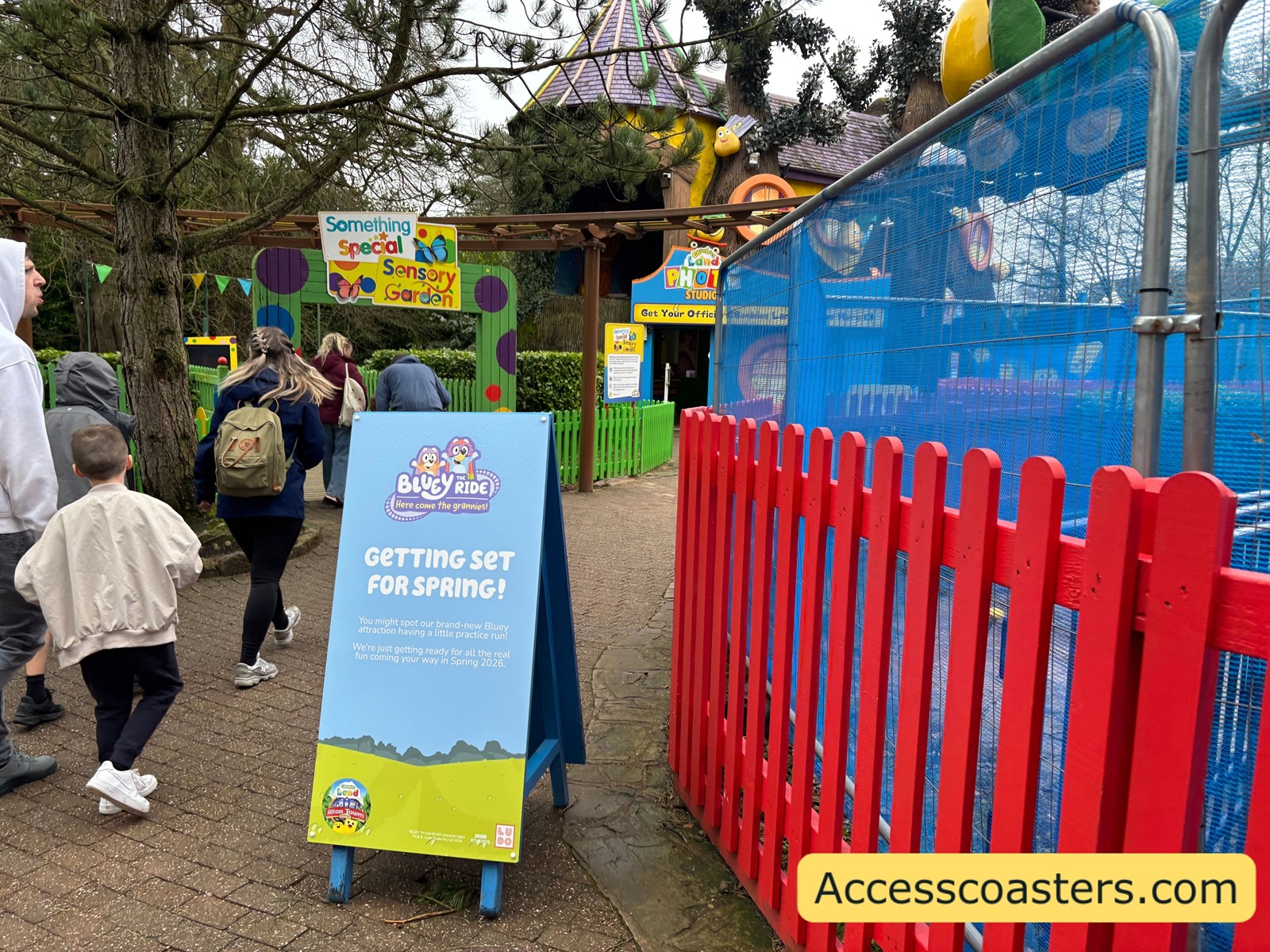 CBeebies Land features a number of rides and attractions themed around some of the most loved CBeebies television shows such as Hey Duggee and In The Night Garden. The Bluey coaster is brand new and will open 28 March 2026. During our visit we saw the ride testing so I have included some images and a video below. It also looks like there is a transfer door on the second to back row for easy wheelchair to ride transfer.