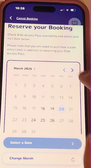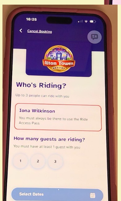 You can pre book the day you would like to use your ride access pass by clicking theme park you would like to visit. You will then need to select the number of people coming with the ride access pass user. You can select a maximum of 3 people this does not include the ride access pass holder so would be max 4 of you in total. If the ride access pass user has a red ride access pass they must have at least 1 guest riding with them. You can then select the date you would like to use your ride access pass.