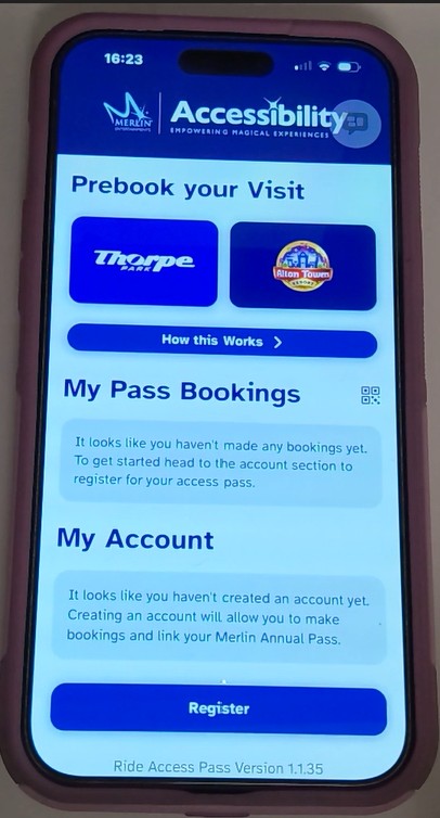 It’s supper simple to set your account up just click the register button and then type your name and Nimbus Access Card number. You can find your access card number on the front of your access card or if you chose an access registration with Merlin the ID number on your email. Before completing your registration you will need to answer yes or no to two questions in order to determined if you get a red or yellow ride access pass. The difference is those with a red ride access pass need a carer over the age of 14 to accompany them on all rides wear as, those with a yellow ride access pass can ride alone. That’s all you need to do to set up your ride access pass ID it will now be added to the home page in your Merlin ride access pass app.