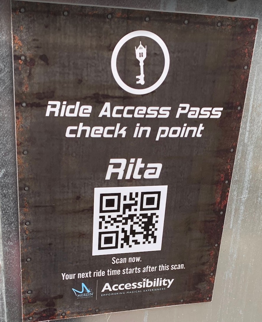 At the entrance to the ride access pass or step free queue for each ride and attraction there is a QR code. In your app you have already selected your ride. Now you can scan in to the ride by scanning the QR code in the app. This will start a countdown the length of the main queue line.