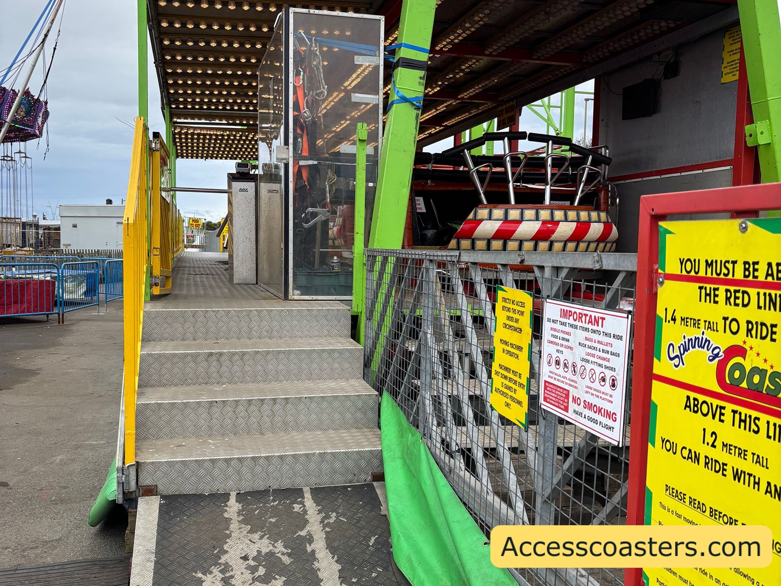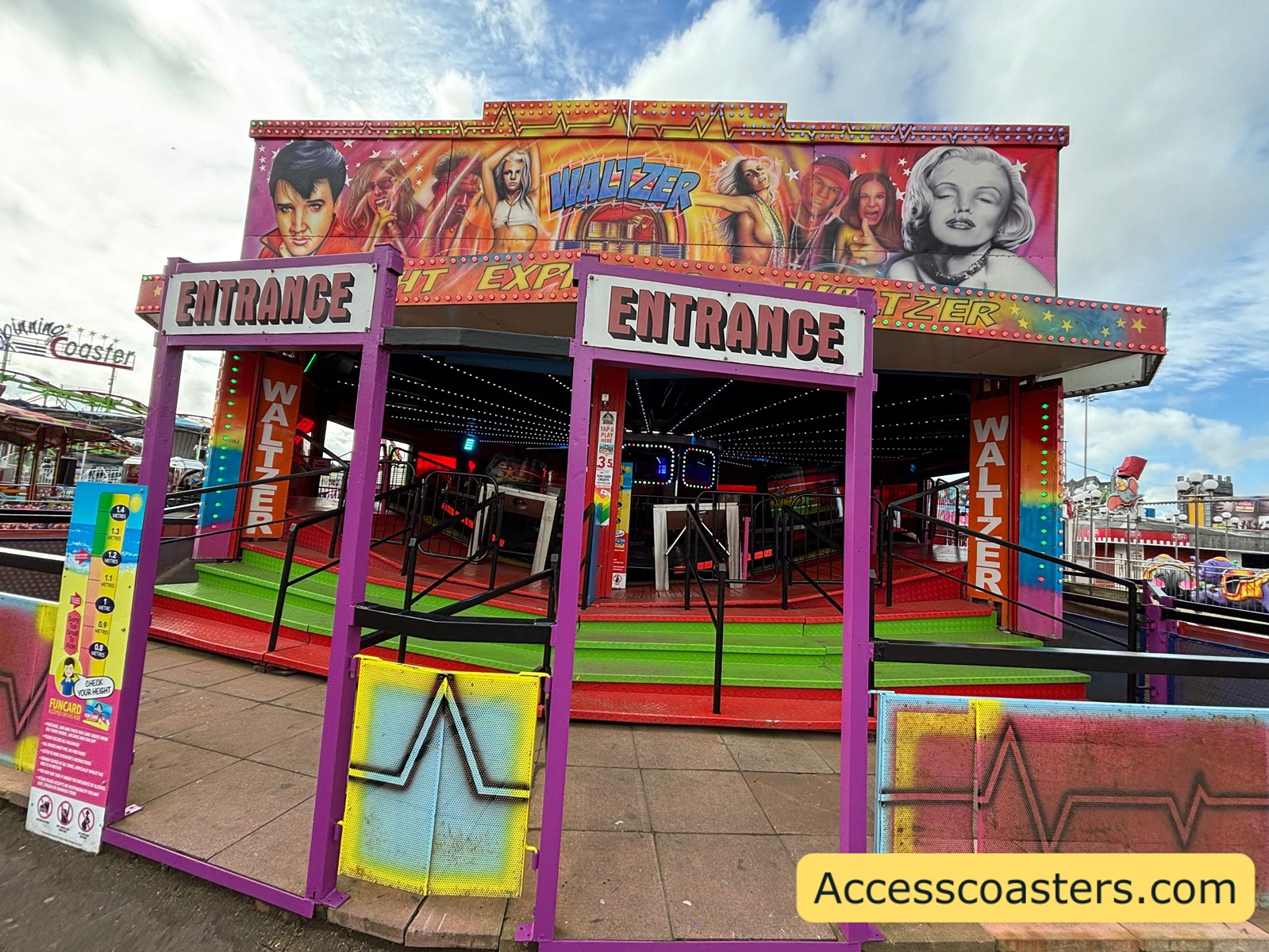 In terms of access, there are a few stairs with handrails to get onto the ride. In order to get into the Waltzer cart it self you need to walk around the ride that is on a slant and can be difficult to navigate. The Waltzer has sensory effects these include loud music flashing/different coloured lights and smoke effects.