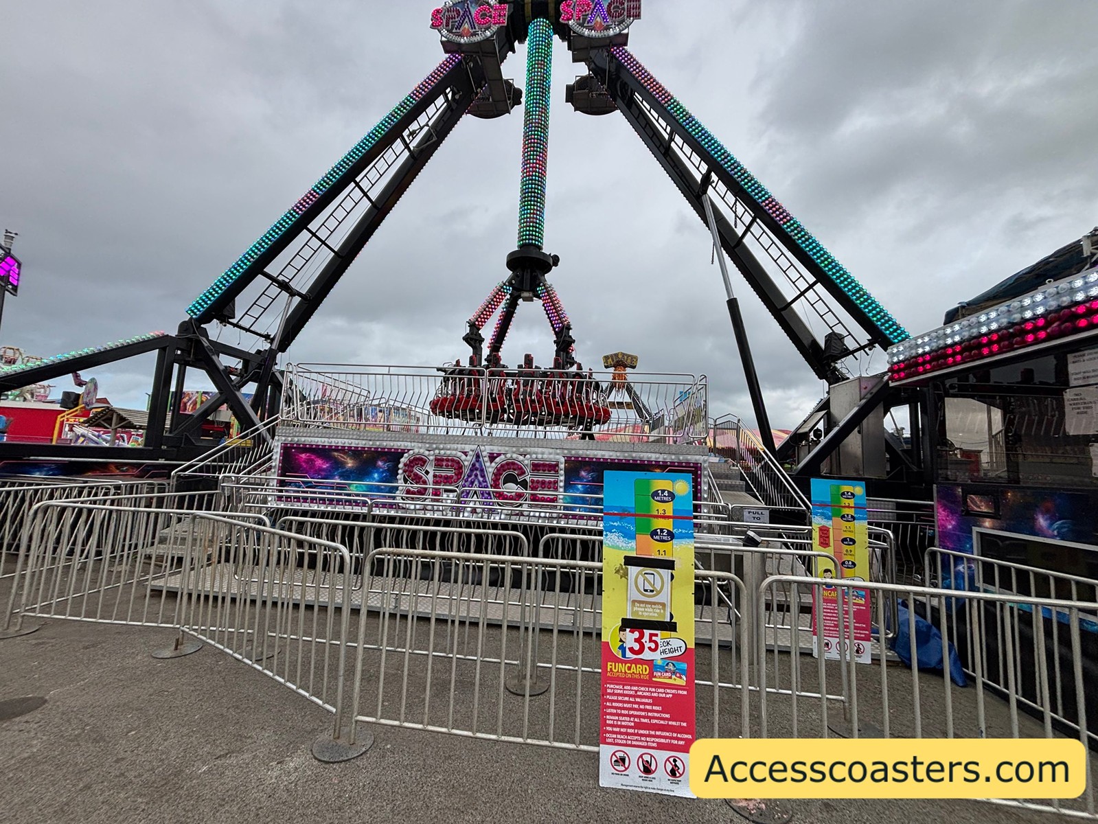 Space was a freak out/claw style ride with some amazing views of the sea and the beach. Space costs 3.5 credits to ride and has a minimum height restriction when accompanied by an adult of 1.27 meters and a minimum hight restriction of 1.4 meters to ride alone.